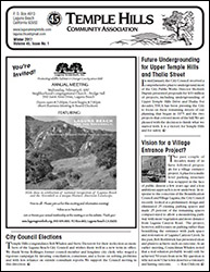 On May 22 we will celebrate a half century of building community togetherness. In early 1973 we opposed a 36-home development on the steep slopes of the south side of Park Canyon. The Planning Commission had voted in favor, but the City Council supported us with a 5-0 vote against the project, and we came together to form the Temple Hills Community Association (THCA). In 1965 more than a hundred of us put together a Temple Hills Specific Plan that was presented to various Councils and mostly implemented in parts over the years. It included 10 detailed maps on Topography, Constraints (fault lines, landslide, flood plain), Geology and Soils, Hydrology, Bicycle-Pedestrian Paths, Slope Analysis, Street System, Utilities, Vegetation and Wildlife, Views and Edges.